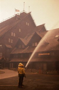I left the Old Faithful Inn before dawn on Sept. 7, not knowing that just hours later determined efforts such as this would help to save the historic structure. (W) 9-7-88 NPS Photo