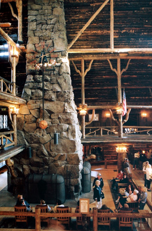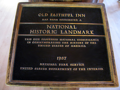 | (left) In 1987 the Old Faithful Inn was added as a National Historic Landmark. Today, fewer than 2,500 historic places bear this national distinction. The following statement of significance describes the Old Faithful Inn's qualification for this status: "This Landmark was the first building in a National Park constructed in an architectural style harmonious with the grandeur of the surrounding landscape. Old Faithful Inn reflects Adirondack Rustic architectural idiom, but blown up to enormous proportions. Its seven-story high log lobby is unique in American architecture. Created with gnarled logs and rough sawn wood for the Northern Pacific Railroad, it has a sense of place as identifiable as the Park itself." (Click here for floorplan of the Old Faithful Inn as submitted on the application for the National Register of Historic Places.) |