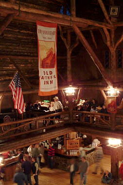 | In the summer of 2004 banners througout the lobby proclaimed the Inn's 100 anniversary, as seen in this photo taken the evening of May 7, 2004, opening day of the Old Faithful Inn's centennial season. |