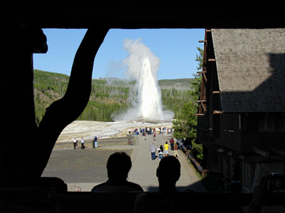 (left) View of Old Faithful from the portico of the Old Faithful Inn. |