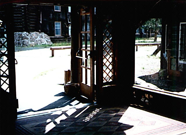 | (above) Located near the back of the large stone chimney is the rear entrance to the lobby of the Old Faithful Inn (seen at left from the exterior). |