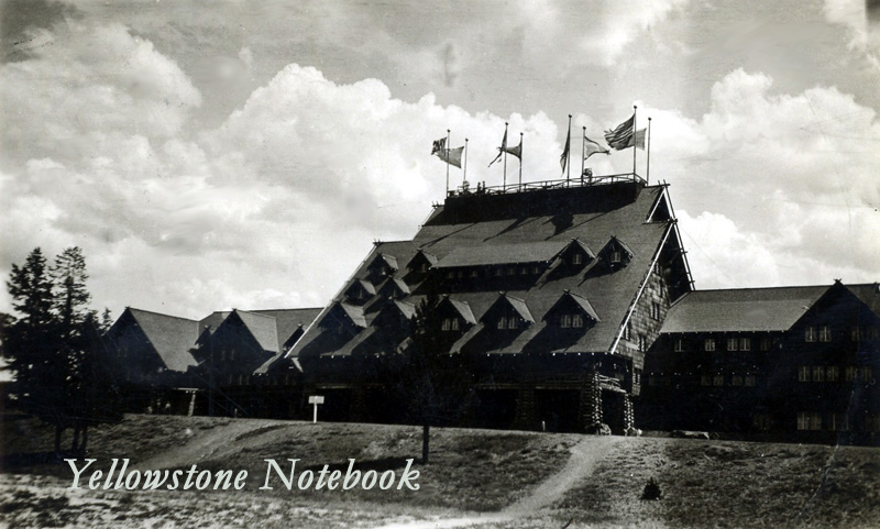 | (right) Photo of the Old Faithful Inn ca 1910 showing original flag display. The US flag is in the right foreground. (photo from the collection of Frank Markley) |