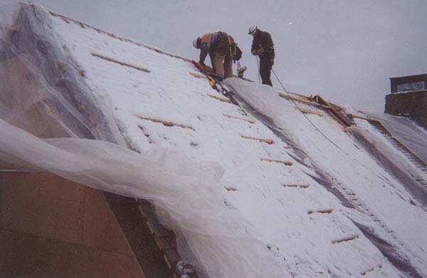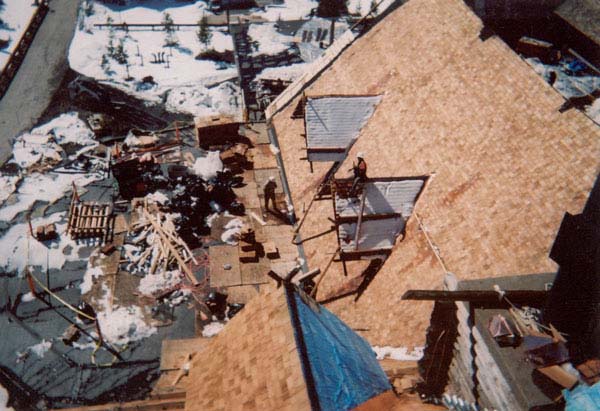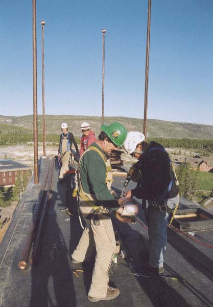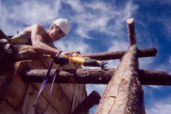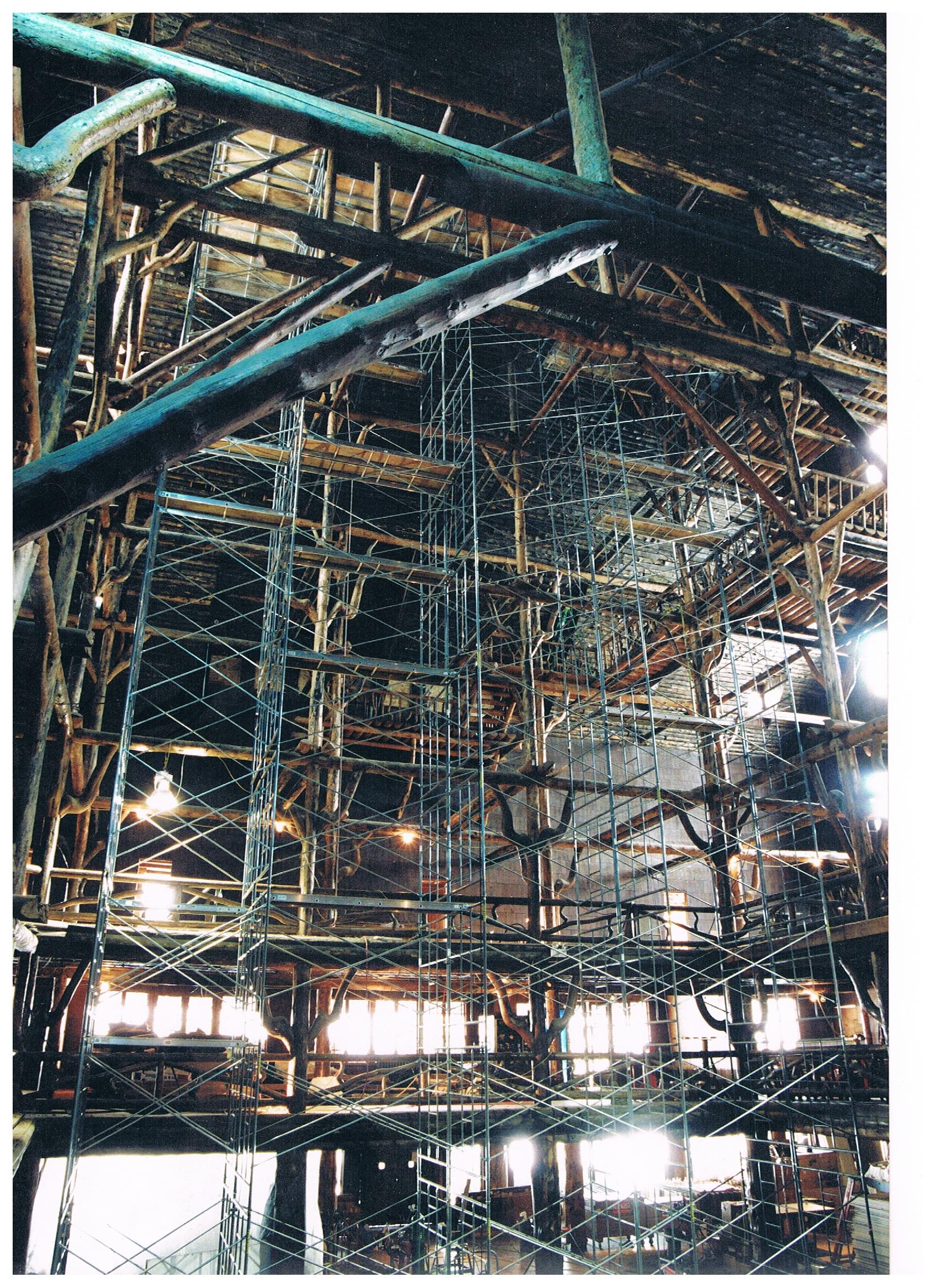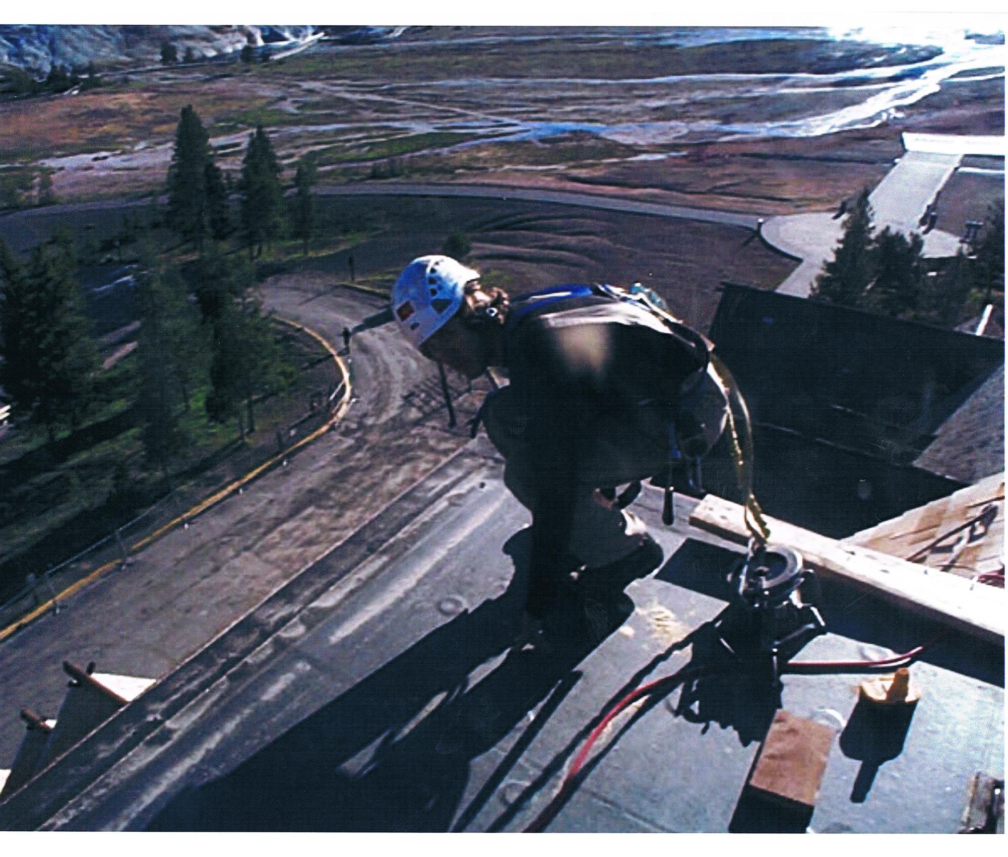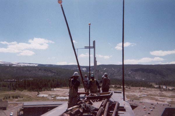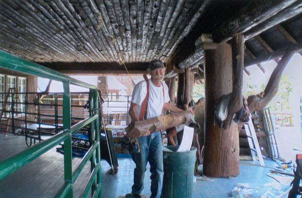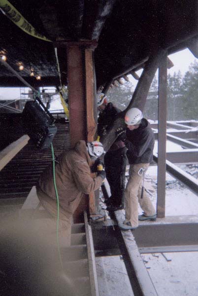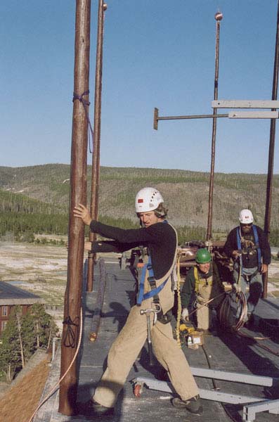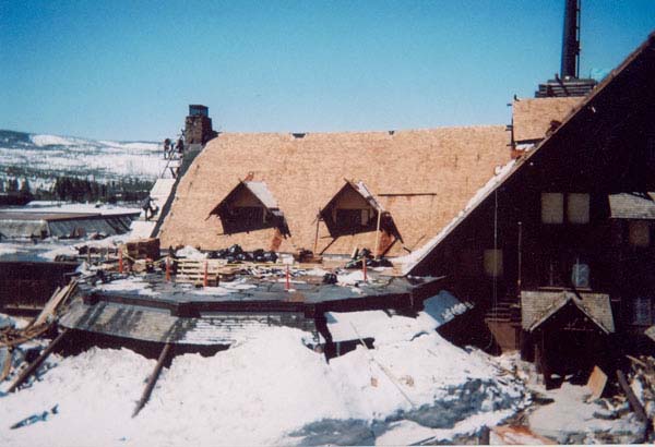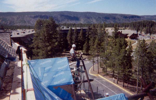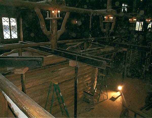 Most photos of the renovation are from the outside looking in; they are views that the park visitor would have seen during the summer season. Those on this page are unique in that they were taken by workers directly involved in the project and used here with permission from Rich Teer of Intermountain Restoration Inc. These and many more photos of the Old Faithful Inn renovation project can be seen on the company's website at http://historicpreservationspecialist.com as well as their facebook page at facebook/historicpreservationspecialist.com. Their websites also include photos from other historic restoration projects, including several in the park such as Yellowstone Lake Hotel and historic structures located in more remote areas of Yellowstone. While exploring their web pages, be sure to look for their comments on some of these and other photos.