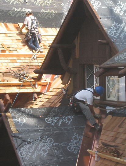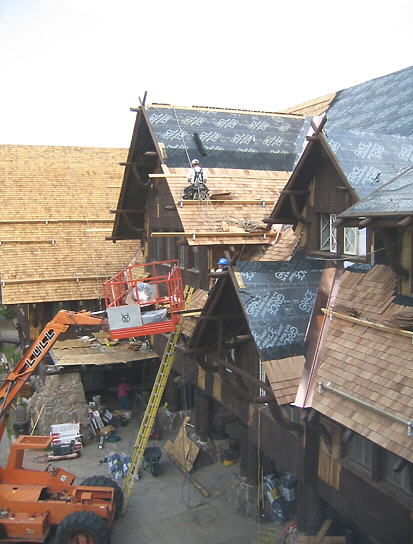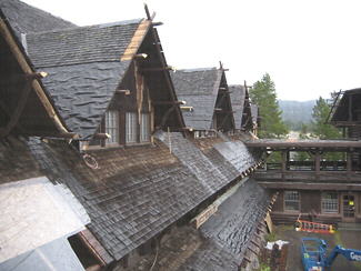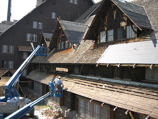 Roofers working on the east wing (front side) of the Old Faithful Inn. Late sleepers in the guest rooms below were reminded each