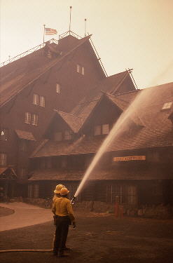 The Old Faithful Inn narrowly escaped destruction by the raging North Fork Fire on September 7, 1988. To discourage alighting sparks from taking hold, the wood shingled roof is soaked shortly before the fire swept through. NPS Photo