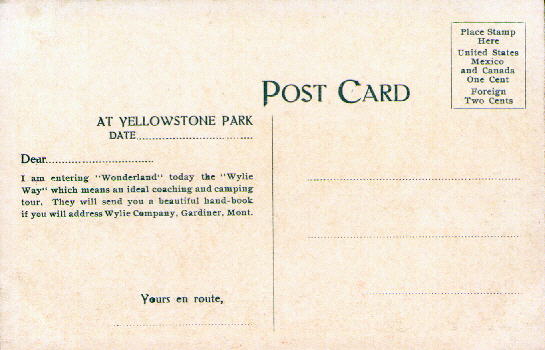 Captioned "Wylie Series No. 2. One of the Eight Wylie Camps--Yellowstone Park," this postcard was printed in Germany for Haynes Pub. It predates World War I, and was given to patrons of the Wylie Camps to send home as a kind of advertisement. The reverse (see photo below) has a preprinted message: AT YELLOWSTONE PARK DATE................................. Dear.................................. I am entering "Wonderland" today the "Wylie Way" which means an ideal coaching and camping tour. They will send you a beautiful hand-book if you will address Wylie Company, Gardiner, Mont. Yours en route, |